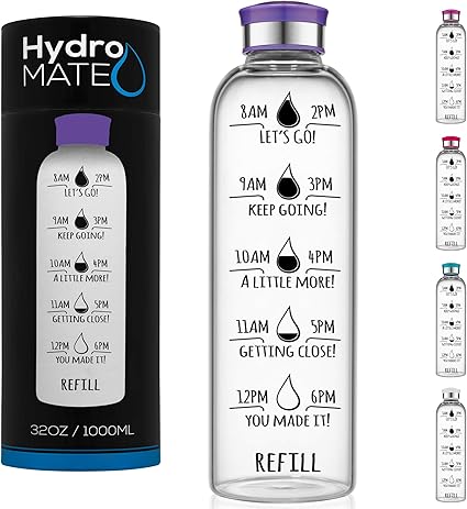 Amazon Com Hydromate 32 Oz Glass Water Bottle With Time Markers Track Water Intake With Motivational Times To Drink Water Reminders Hydro Mate 1 Liter Purple Sports Outdoors