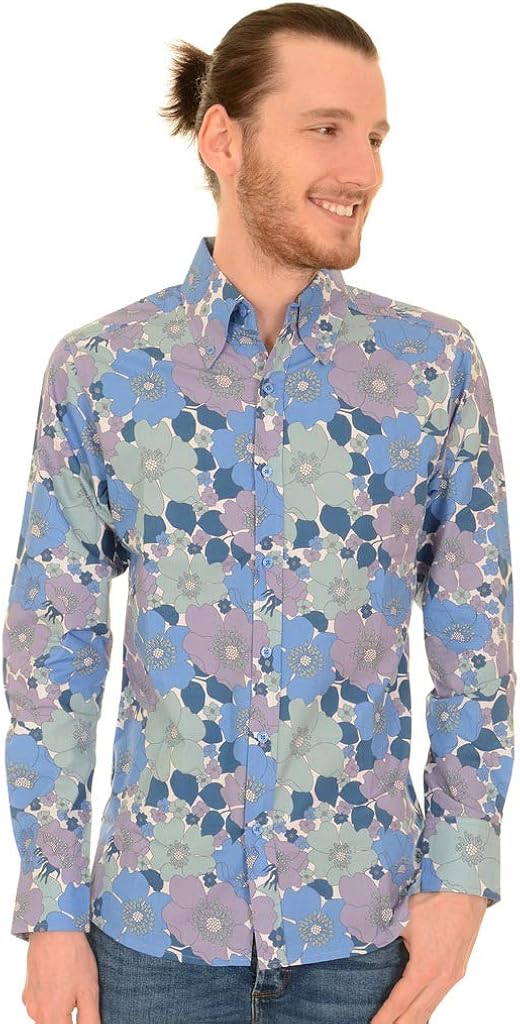 Run Fly Mens 60s 70s Retro Blue Floral Button Down Long Sleeve Shirt X Large At Amazon Men S Clothing Store