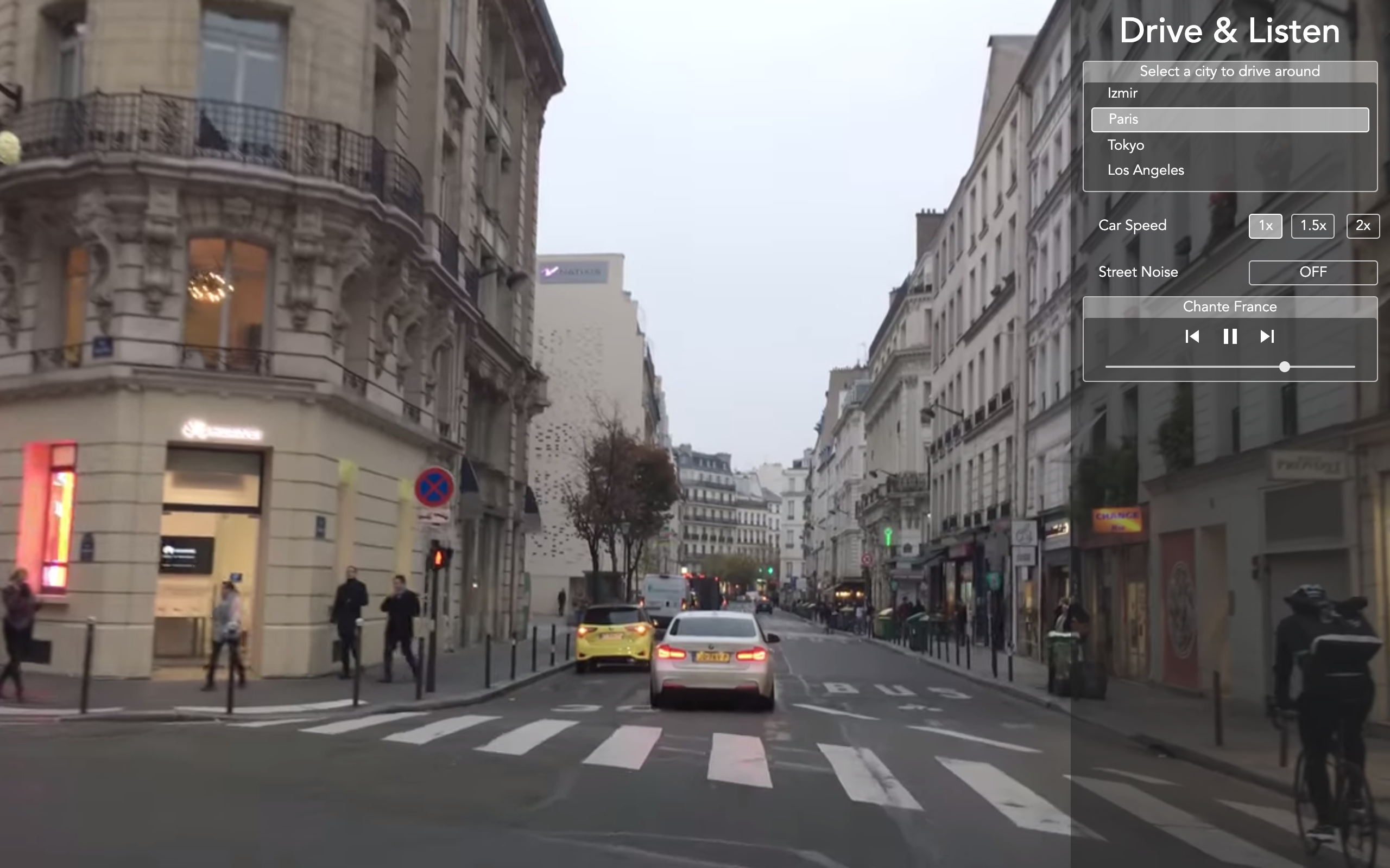 Drive around cities while listening to their local radios Listen to local radio stations while driving through the cities around the world. Drive Listen app takes you on a virtual car ride through cities of the world Take a driving tour of Seoul Istanbul Paris and many more via this unique app Joe Lorio.